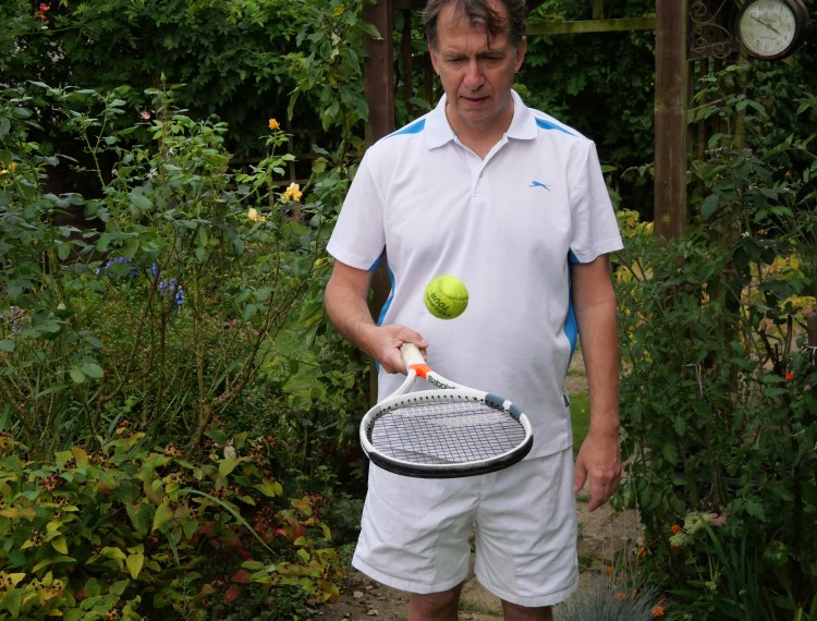 Trying to bet more control over my subject I again got my long-suffering husband to help. He’s a big tennis fan, both watching and playing, so it was natural for him to pick up a bat and ball. He was really not keen on the first attempt with the orange foam ball as he hadn’t ‘prepared’ himself but from my point of view these shots worked. The background could have been a bit brighter, but on the whole the shutter speed adequately ‘froze’ the moment.