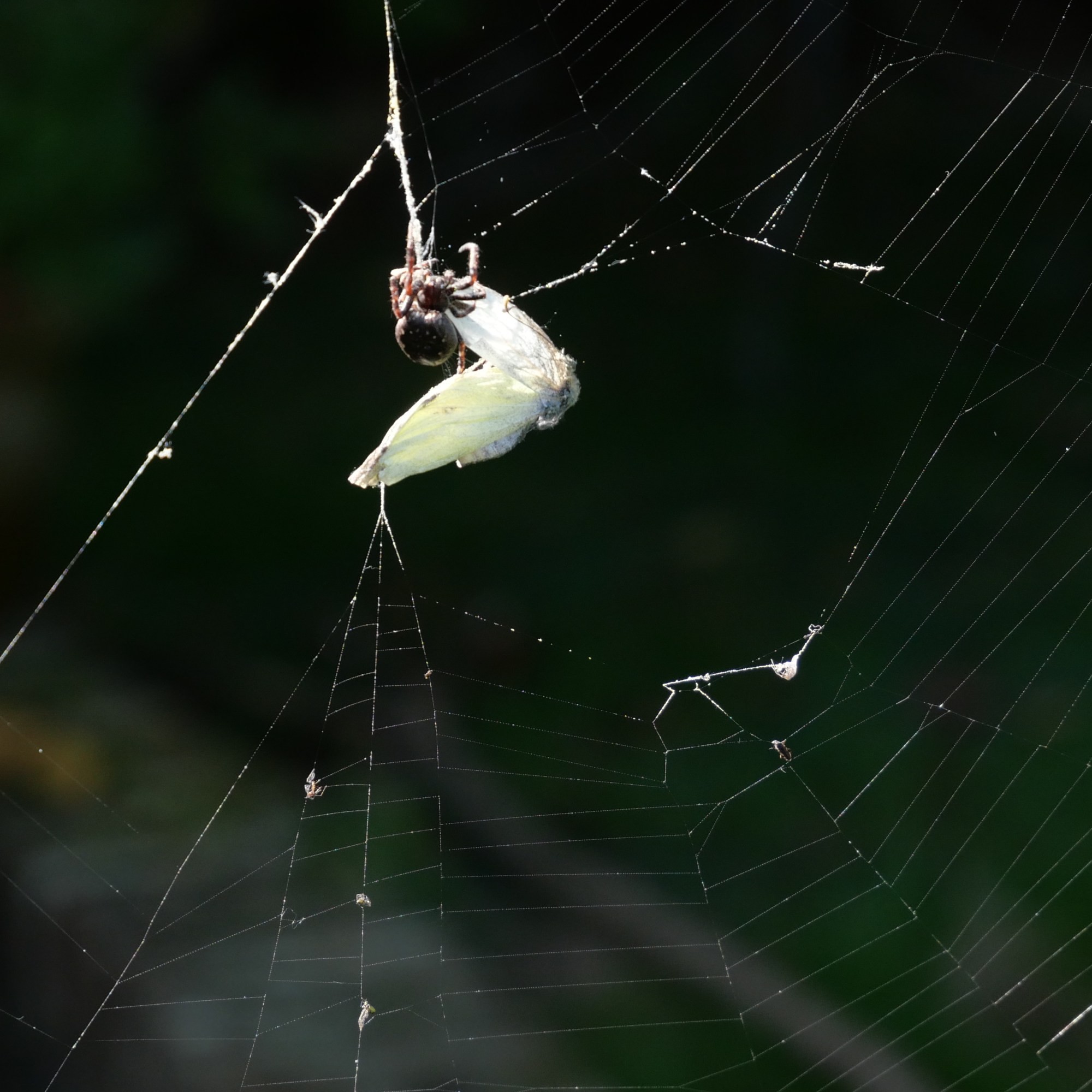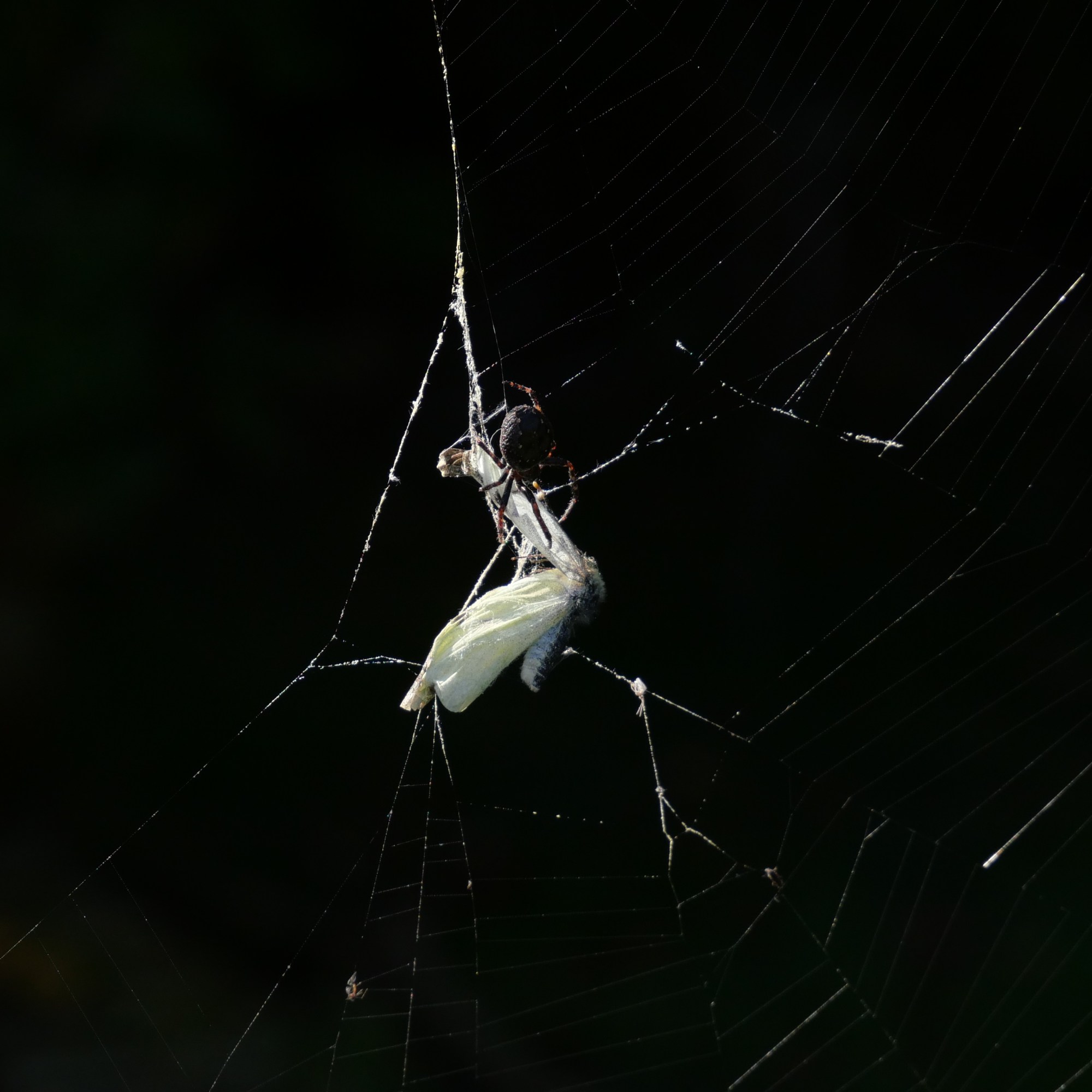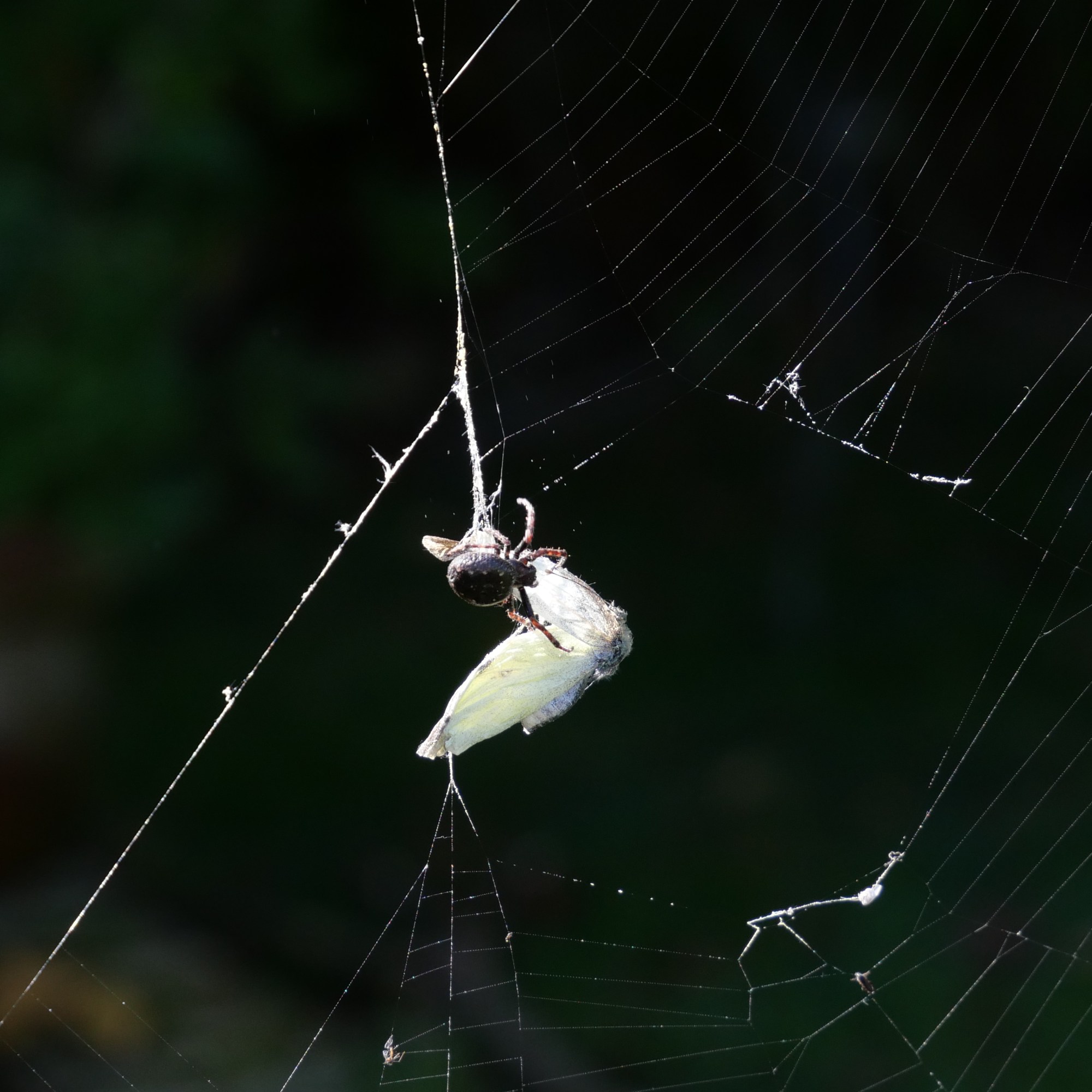 The next try wasn’t planned at all. Out in my garden I noticed a butterfly which had just got caught in a spider’s web. Rather macabrely, I set up my camera to take photos of it. As I deliberated on whether or not I should try and free it from its prison, a large spider shot down from its hidey-hole in the clock and sealed its fate. I used a fast shutter speed to capture its final moments. The background in particular looked very dark at times due to the chosen ISO and although this meant it probably wasn’t a correct exposure, I did like the effect that it produced.