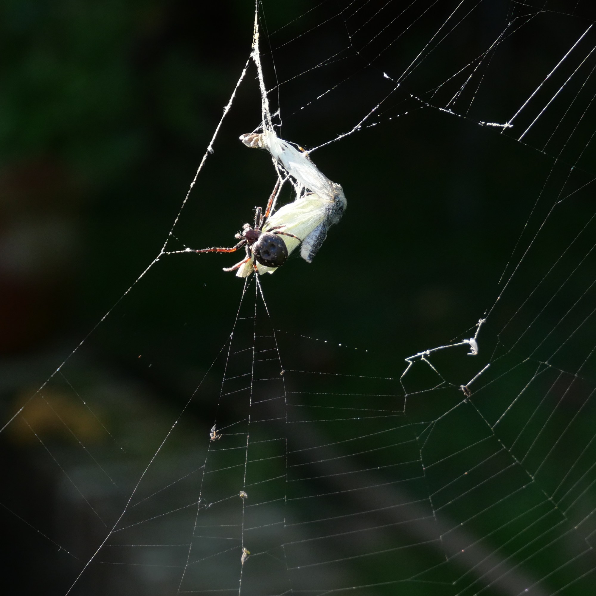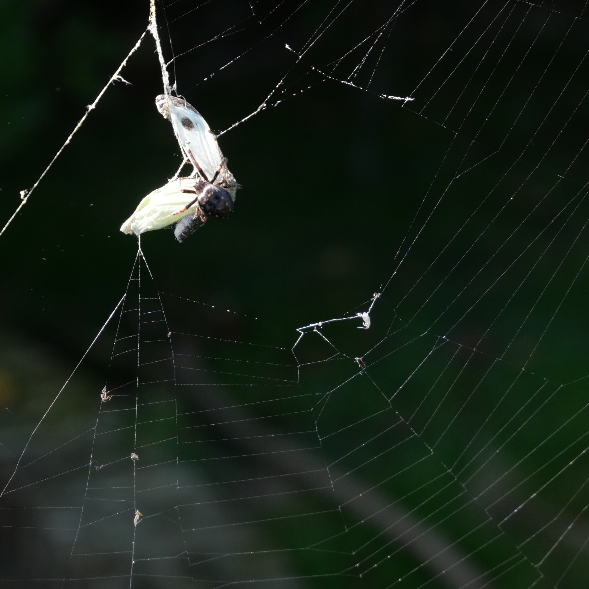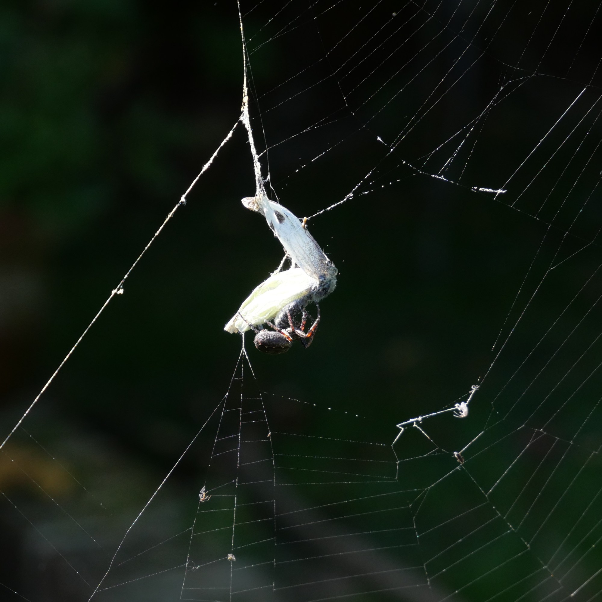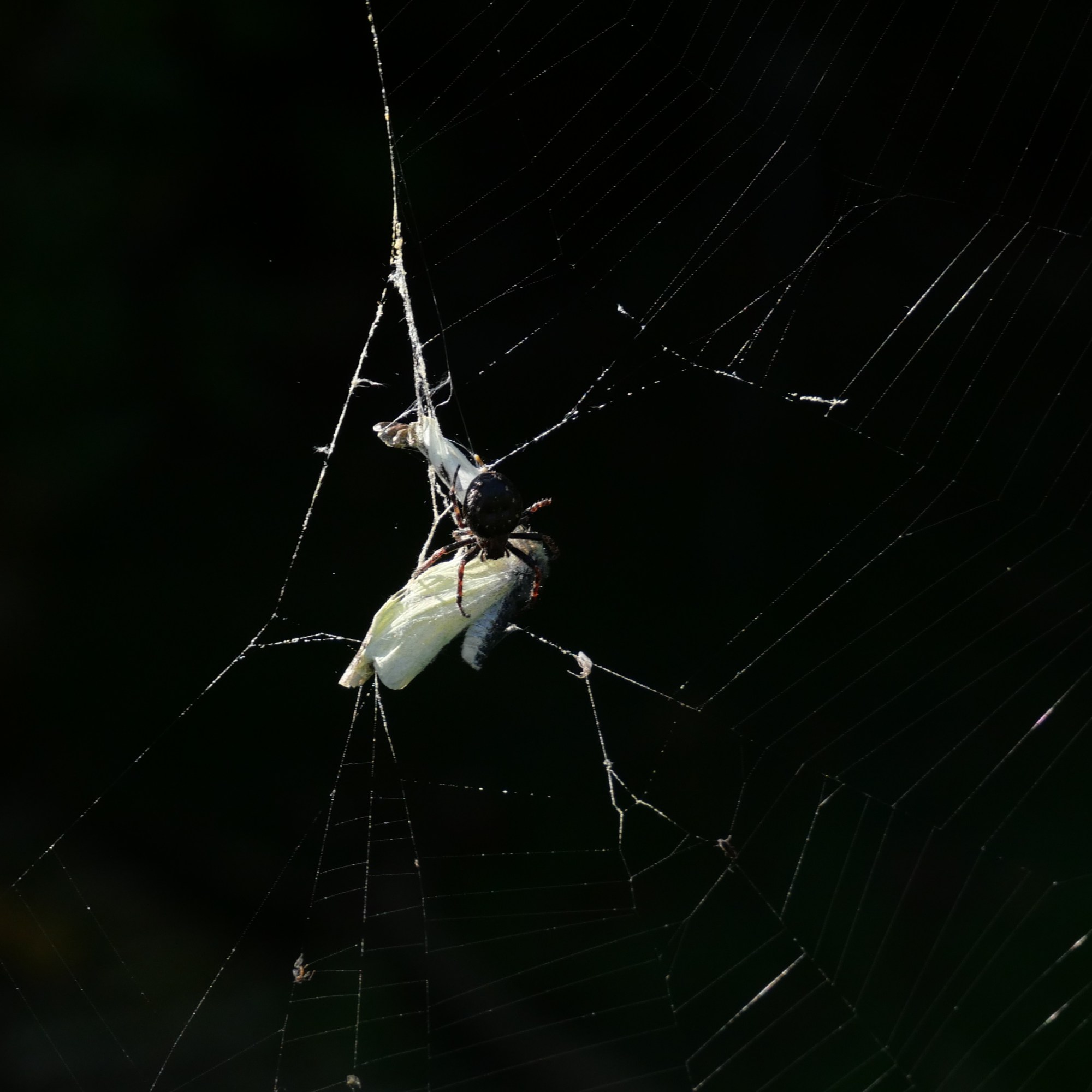 The next try wasn’t planned at all. Out in my garden I noticed a butterfly which had just got caught in a spider’s web. Rather macabrely, I set up my camera to take photos of it. As I deliberated on whether or not I should try and free it from its prison, a large spider shot down from its hidey-hole in the clock and sealed its fate. I used a fast shutter speed to capture its final moments. The background in particular looked very dark at times due to the chosen ISO and although this meant it probably wasn’t a correct exposure, I did like the effect that it produced.
